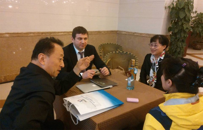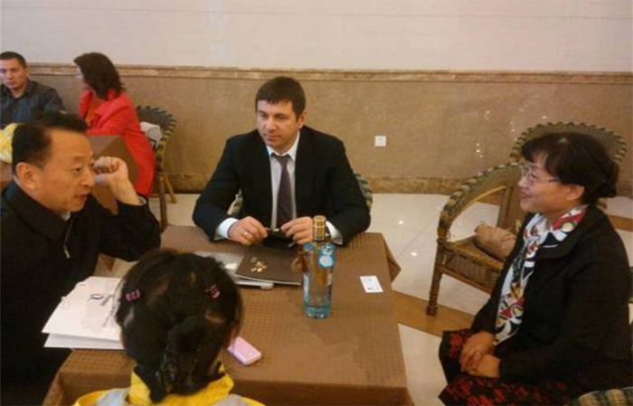 2013年10月9日,黑龙江省对俄经济合作贸易洽谈会在哈尔滨市华旗酒店公寓隆重举行,陆昊省长做为我省代表团团长,亲率省内一百余家重点企业参加会议。北大仓集团公司总经理隋熙凤参加了洽谈。洽谈会上,隋总经理在黑龙江省出入境检验检疫局局长高建华的引荐下,与阿穆尔州副州长进行了友好会晤。洽谈会上,高建华局长把北大仓酒作为黑龙江省精品进行了推介,向俄方代表详实地介绍了北大仓的企业和产品,隋总经理就俄方的询问进行了补充回答,中俄双方进行了广泛的探讨和交流。俄方代表对北大仓酒表现出浓厚的兴趣,对北大仓的传统工艺和文化赞叹不已,对产品的品质赞赏有加,很多客商都表达了强烈的营销合作意向。图为阿穆尔州副州长手捧北大仓酒喜笑颜开、爱不释手。