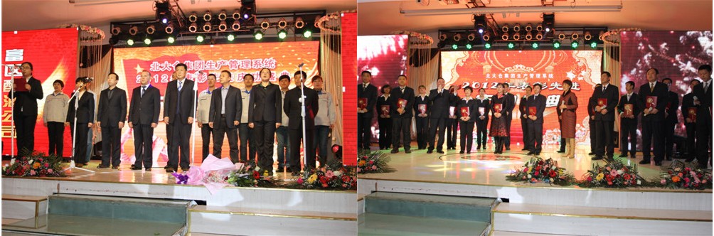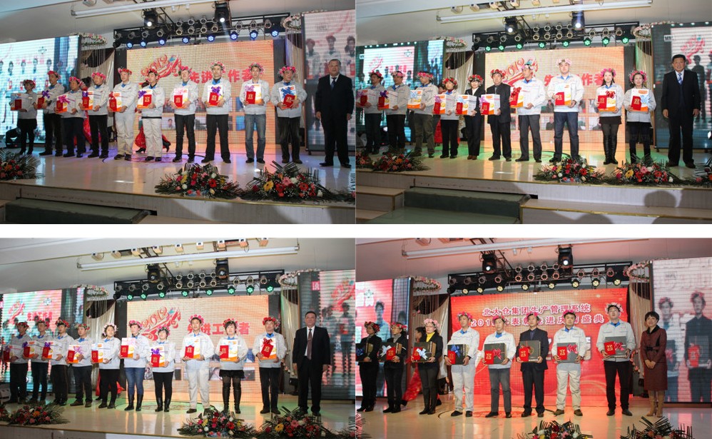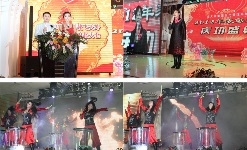 2013年3月9日下午三点,北大仓集团生产管理系统2012年表彰先进庆功盛典在大金山国宴楼5楼隆重举行。 首先大屏幕播放了生产系统各个团队展示画面,接着以铿锵激越的水鼓舞拉开了本次盛典的帷幕。主持人致开场词后播放了《一飞冲天北大仓》短片,以影像资料的形式回顾了2012年公司取得的成绩。总经理隋熙凤女士在主持人的邀请下,上台致开幕词。隋总历数了2012年公司各项工作取得的重大成就,指出销售业绩的再创新高,离不开生产系统的支持与保障。隋总深情的讲话激励了现场的每一个与会者,大家都深信北大仓的明天会更加美好。